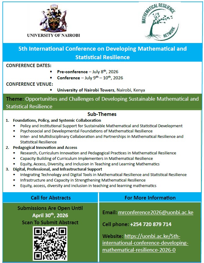 The University of Nairobi, through the Faculty of Education, will host the fifth International Conference on Developing Mathematical Resilience. The Conference will be held on July 8 -10, 2026. It will anchor on opportunities and challenges of developing sustainable mathematical and statistical resilience. The focus areas will be on policy, multidisciplinary collaboration and partnerships; research, curriculum innovation and pedagogical Practices; integrating technology and digital tools; equity, access, diversity and inclusion; and Institutional support for sustainable mathematical and statistical development